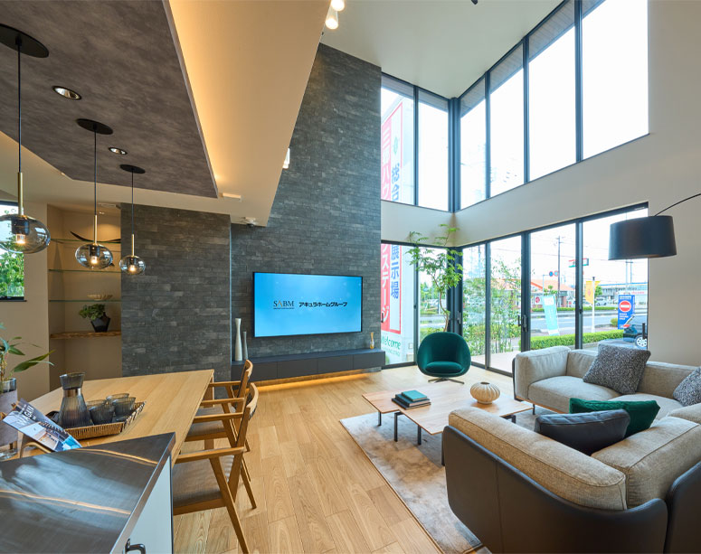 吹き抜けの開放感と家族が集まるリビングはアキュラホームだからこそ実現できる超空間、大開口のリビングです。「もっと広く、もっと高く」をコンセプトに、陽光あふれる空間をお楽しみいただけます。