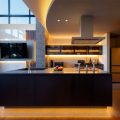 R天井の曲線美・壁・足元のライティングが優美なオリジナルキッチンと食器棚