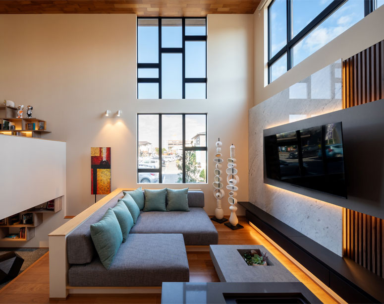 視線と気配が繋がるLDKに設けたスキップフロア、暮らしに映える陰影を愉しむ飾り棚