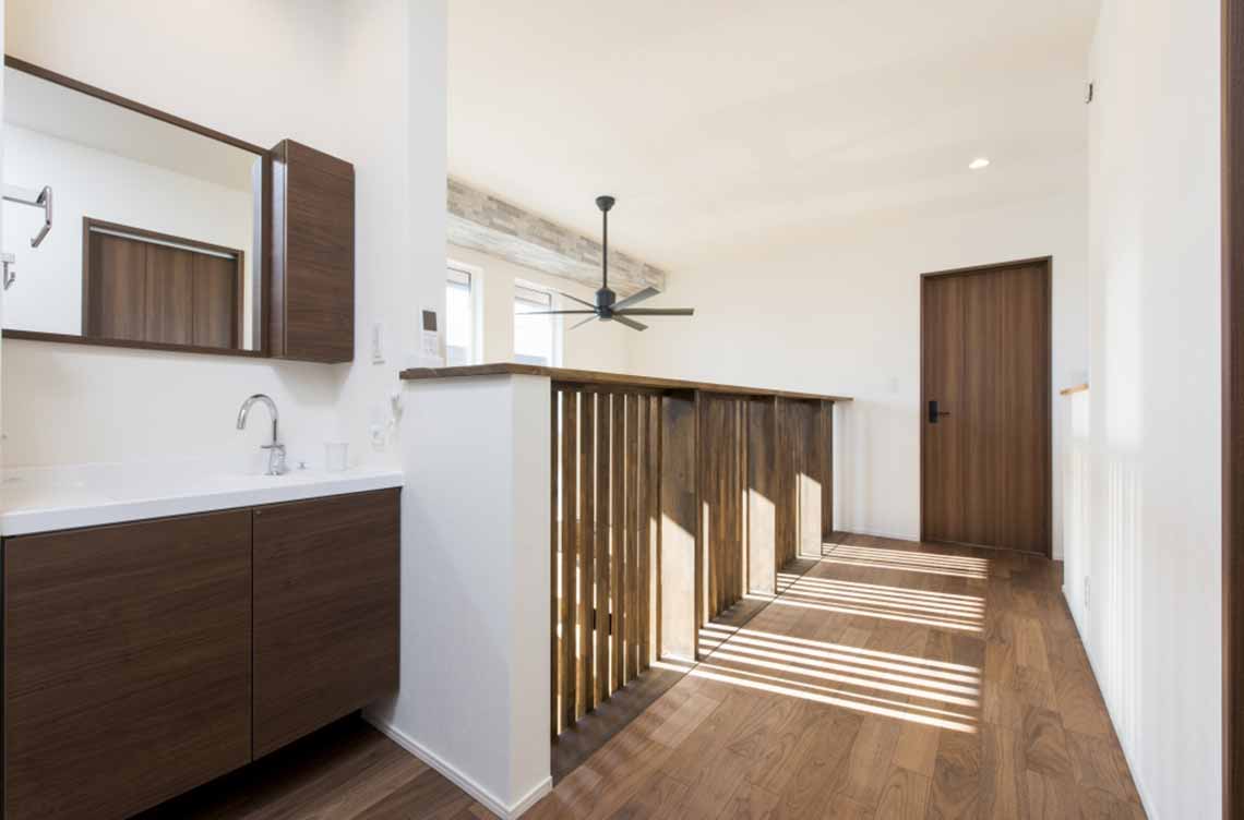 リビングに広がる吹き抜けと、階段の踊り場を利用した遊び心溢れるスキップフロアが特徴的なお家。スタイリッシュでかっこいい家を作るのがご希望とのことで、高級感溢れる大理石調の床を使用して美術館のようなモダンな空間に仕上げました。ランドリールームは「洗って干して畳んでしまうがすぐに完結する動線で、洗濯が非常にラクになった!」と、作って大変満足したそう。デザイン、家事動線、スキップフロア、吹き抜け、間接照明等、担当者一同が自信を持って提案した間取りは非常に魅力的です。