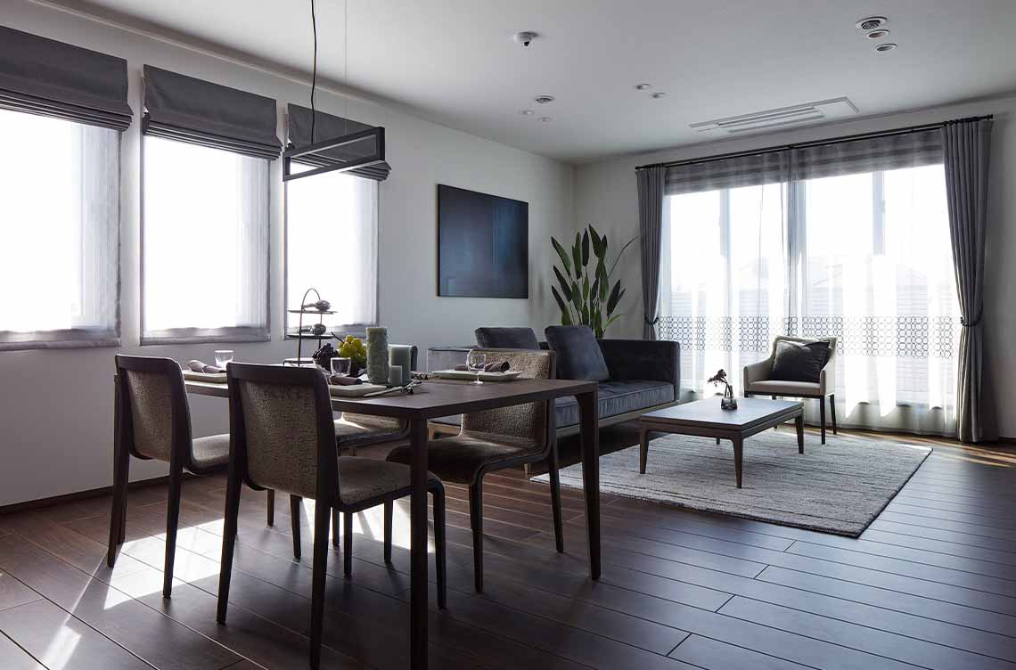 世帯を超えていつでも家族みんなの気配を感じられる大きな吹き抜けと、三つの連続した窓から差し込むたくさんの自然光で明るく開放的なリビング空間を実現しました。親世帯子世帯共有で使用する玄関は、広々と贅沢に計画することで、みんなでのお出かけ時もスムーズに。散らかりがちな家族の靴も大容量収納のシューズボックスでスッキリ。また、和室や書斎スペースはちょっとした作業、趣味を行ったりなど各々が集中したい時に最適です。