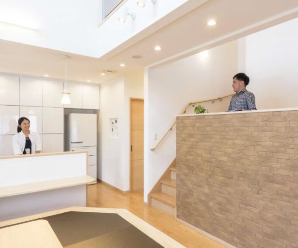 居心地リビング:一段リビングを下げ、中庭の自然を近くに感じられるリビング。 ソファにお掛けいただくとまるで高級旅館のような居心地の良さを感じていただけます。