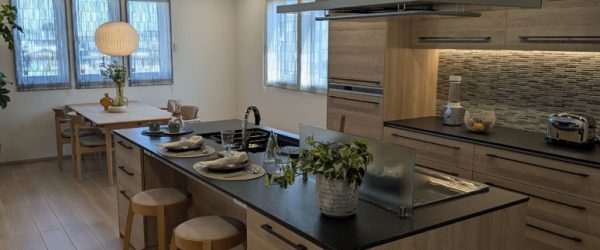 左右に大きな窓、上部に吹抜けが設けられ、開放感たっぷりなダイニング・キッチンです。 リビングよりも床を一段高くすることで、ゆるやかにゾーンを分けました。 床暖房も完備し、冬は足下からふわりと暖かです。