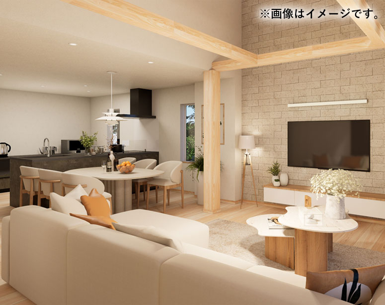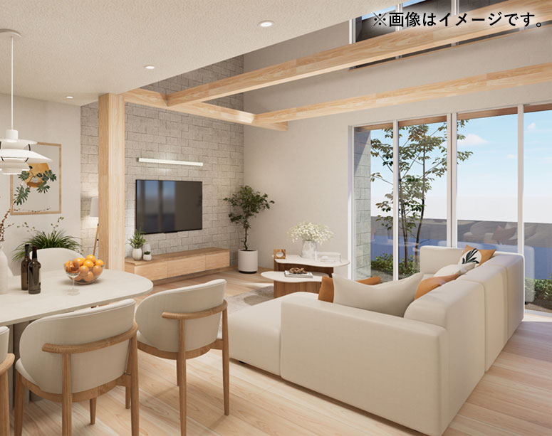 居心地リビング:一段リビングを下げ、中庭の自然を近くに感じられるリビング。 ソファにお掛けいただくとまるで高級旅館のような居心地の良さを感じていただけます。