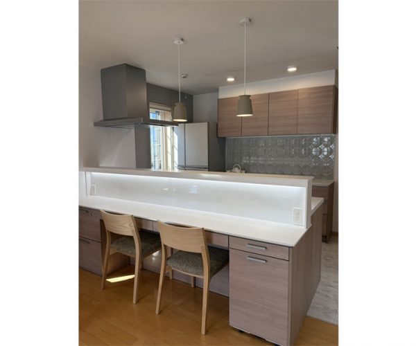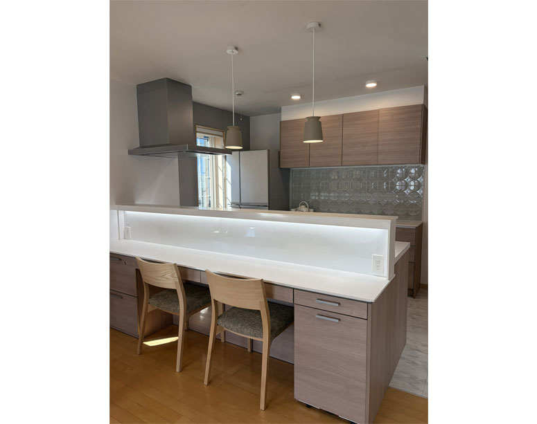 左右に大きな窓、上部に吹抜けが設けられ、開放感たっぷりなダイニング・キッチンです。 リビングよりも床を一段高くすることで、ゆるやかにゾーンを分けました。 床暖房も完備し、冬は足下からふわりと暖かです。
