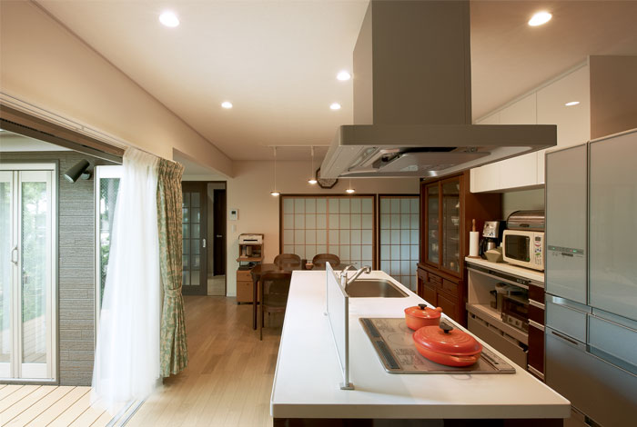 躯体を変更できないリフォームでも、ハウスメーカーの緻密な専門設計なら大きくアップデート。ハウジングステージ大宮北のショールームには、水回りの位置を変えずにキッチンを数10センチずらして、新しい家事動線をつくり出した匠の技が展示されていました。