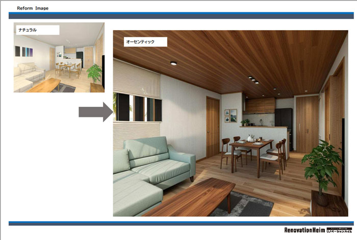 「お客様が『こんな写真みたいな雰囲気で』とSNS画像をお見せいただくことが多いのですが、実際にご自身の家に当てはめたときのイメージは想像しにくいですよね。そこでリノベーションハイムではAIツールを使い、同じ空間で色味や照明を変えたシミュレーションをすぐに表示してお見せできます。自分の家での完成形を具体的に思い描いていただけます」