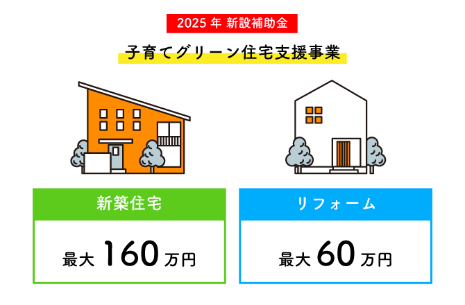 新築住宅を建築や購入する、子育て世帯や若者夫婦世帯、特定のリフォームを実施する世帯などに向けた2025(令和7)年度の補助金事業です。(こどもみらい住宅支援事業は、申請を終了しています)