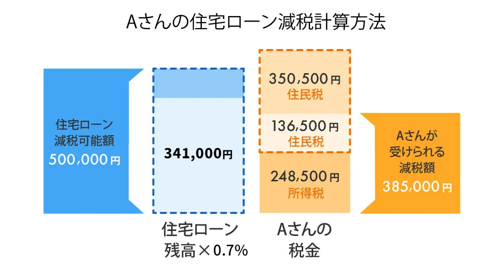 Aさんの所得税248,500円は341,000円の枠内に入っているので全てが減税対象となり、減税しきれない分は翌年の住民税からも減税できます。ただし住民税からの最大減税額は136,500円なので、Aさんの住民税からの減税額は、残りの92,500円全額が控除となります。結局Aさんの1年目の住宅ローン減税額は341,000円となります。