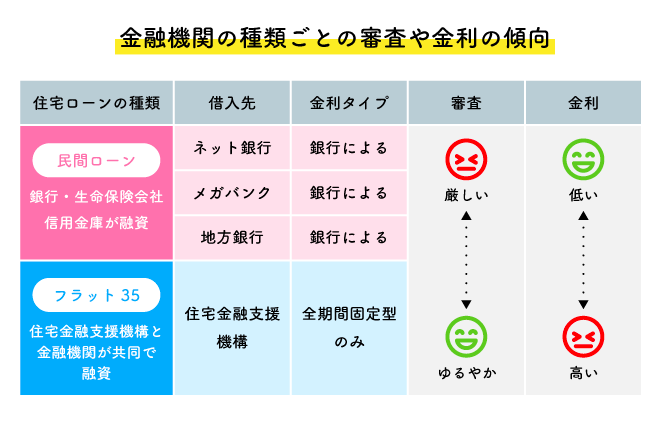 以下で、金融機関の種類ごとの審査や金利の傾向をご覧ください。金融機関によって金利優遇や手数料の割引、団信(団体信用生命保険)のコース拡充など、サービス内容は多種多様です。ネット銀行や地方銀行、信用金庫なども含めて、借入先候補は多角的に検討しましょう。