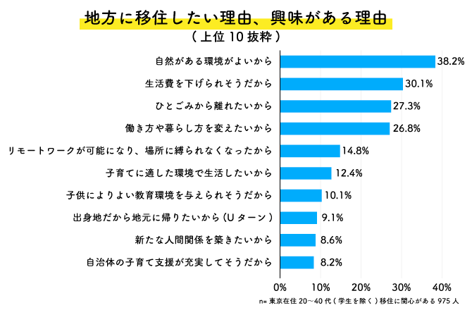 以下は、地方に移住したい理由、興味がある理由を調べたデータです。ここに挙げられた理由はそれぞれ現実的で、実現も可能な内容ではないでしょうか。