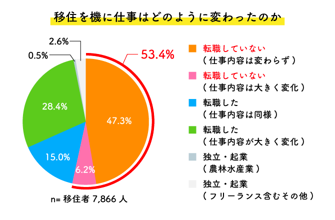 実際に、移住組の職業状況はとても多彩です。以下は移住を機に仕事はどのように変わったのかの調査です。