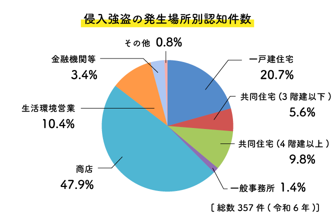 2024年に東京都で起きた侵入強盗の認知件数は、総数で357件です。そのうち20.7%が一戸建てで発生しており、約74件に相当します。マンションでは15.4%、もっとも多いのは商店の47.9%となっています。