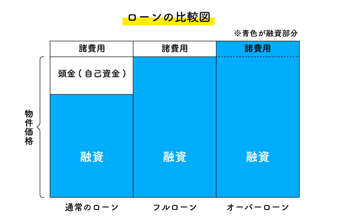 対して、住宅の価格目いっぱいまで借入金額を設定するのがフルローン、諸費用などの部分まで借入するのをオーバーローンと呼びます。住宅価格を超えた状態をオーバーローンと呼ぶのは前述のとおりです。