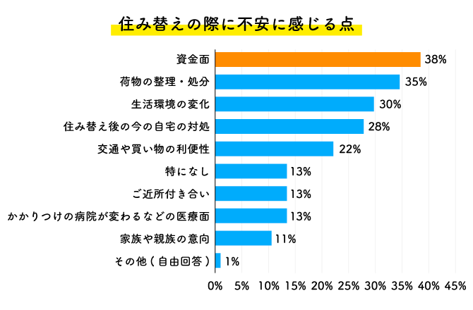以下は、住み替えの際に不安に感じる点についての調査データです。やはり資金面を挙げる率が38%で、ほかの不安要素を抑えてもっとも高くなっており、資金面における読みの困難さを表しているといえるでしょう。