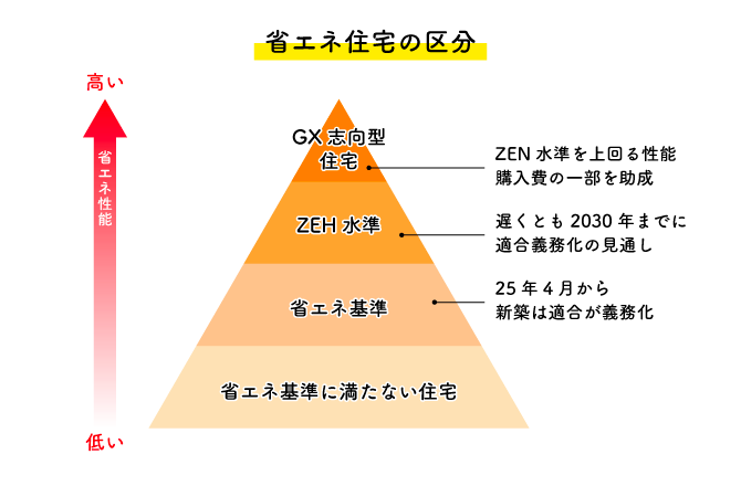 新設されたGX志向型住宅のGXとは、グリーントランスフォーメーションの略称で、脱炭素社会の実現に向けた取り組みを行うことを意味しています。簡単にいうとGX志向型住宅は、従来のZEH水準よりも高い省エネ性能基準を満たす住宅です。