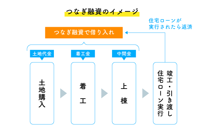 つなぎ融資は、土地代ほかの事前の支払いのために融資を受けるつなぎ専用のローンで、本体の融資が実行されると返済するものです。(下図参照)