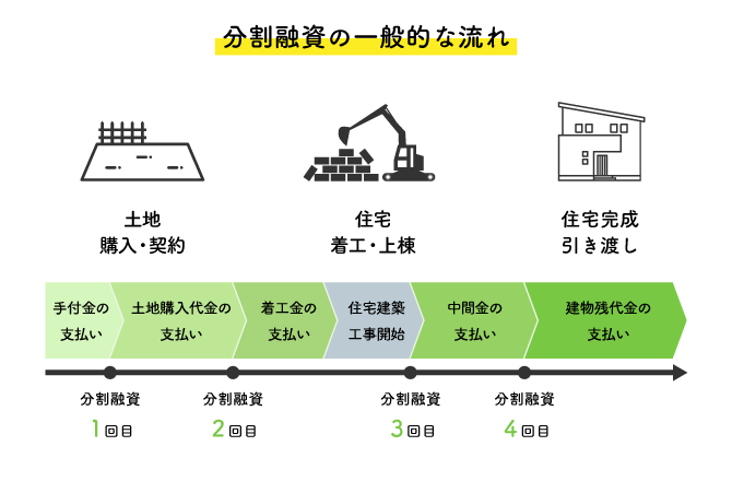 前述のように、諸費用・着工金・諸費用等を一括で借り入れ、支払っていくつなぎ融資と異なり、分割融資の場合は支払いが必要となるそれぞれのタイミングで3回、もしくは4回にわたって融資が実行されます。