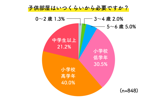 以下は、子供部屋がいつくらいから必要かという意識調査です。「小学校のうちに」という意見が7割を占める結果になりました。