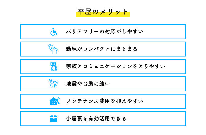 加えて、2階建てに比べて女性や高齢者の一人暮らしでも安心な、バリアフリー性能の高さ、維持のしやすさも、大きなメリットとなります。
