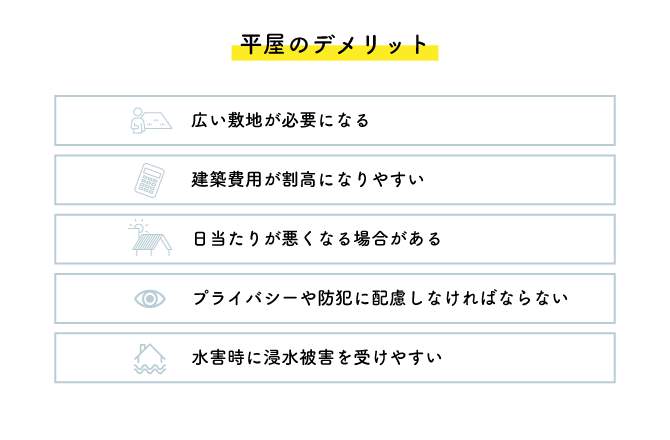 平屋はメリットだけではなく、その構造上の特性からくるデメリットも考慮しておく必要があります。ローコストな平屋を建てる際には、このデメリットを注意点として意識しましょう。