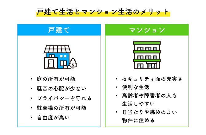 対して集合住宅はセキュリティが充実し、耐震性も高いことが多いため長く住んで安心な側面があるでしょう。大規模なマンションは立地=生活の利便性に恵まれている物件が多く、老後も安心です。大部分の物件で階段のないワンフロアである点も、高齢の方には有利といえます。