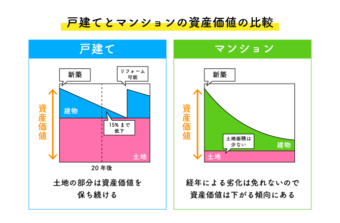 戸建てはリノベーションやリフォームでリセールバリューが高まる傾向にあるほか、元々価格の中で土地の比率が大きいため、価値を維持する部分が大きいという特性があります。