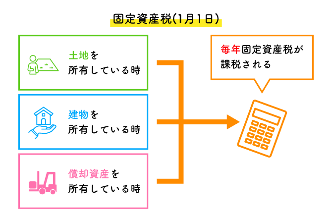 - ● 納税義務者:毎年1月1日時点の、その固定資産の所有者が対象となって課税される。