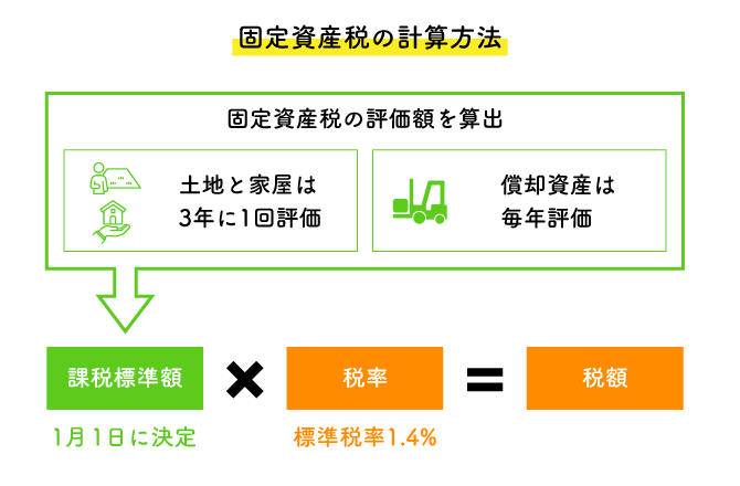 課税標準額は、自治体で決める固定資産税評価額が用いられます。税率である1.4%は、自治体の財政状況や収税目的によって変更して良いことになっているので、確認が必要です。