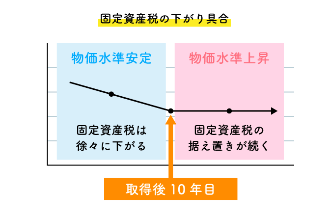 ただしこの図のように、最初の10年は値落ちが激しいものの、以降はインフレや不動産価格高騰の影響で、据え置きの状態が続くという傾向がよく見られます。