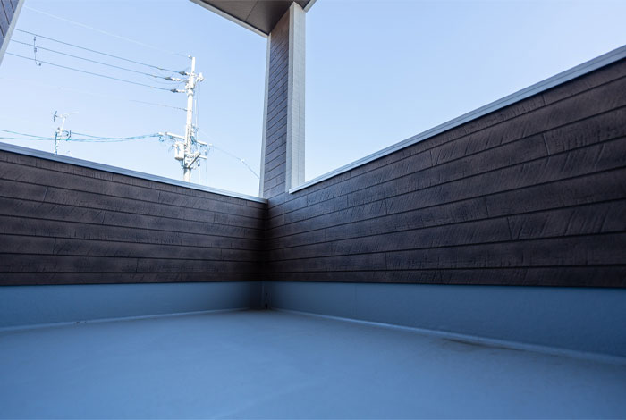 インナーバルコニー部分の屋根材を工夫しましょう。ほかの2階部分と同じにすることも可能ですが、高価となります。ポリカーボネート・アルミ・樹脂板などを使用することで、価格を抑えることが可能です。