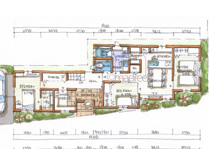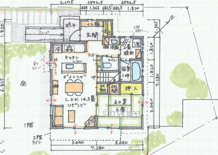 共有する玄関や水回り、物干し場などを利用するときに、ほかの世帯を経由していくことのないようにつくるとお互い気兼ねが少なく、長い目で使い勝手のいい間取りとなります。